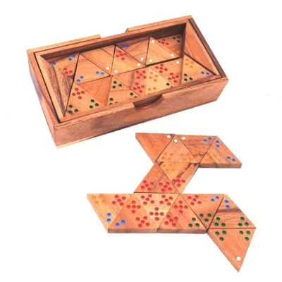 56 dreieckige Dominospielsteine enthält die viereckige Aufbewahrungsbox mit Stülpdeckel. Die Wertigkeiten der Steine werden durch die Anzahl von farbig ausgefüllten Mulden gekennzeichnet. Jede Wertigkeit hat ihre eigene Farbe. Im Spiel gibt es zwei Möglichkeiten, den nächsten Stein an einen Dreieckstein anzulegen. Aber es müssen auch die genaue Anzahl der Punkte an der richtigen Stelle stehen! Die Spielsteine haben eine Kantenlänge von 45 mm und eine Dicke von 8 mm. Somit lassen sich gut aufnehmen.